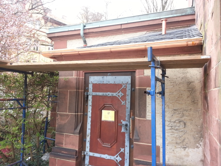 Die «Altenstube» (rot markiert) ist ein Nebenraum der Friedenskirche, der sich nördlich des Kirchraumes befindet. Der im September 1905 für den Kirchenbau gezeichnete Erdgeschossgrundriss (rechts der Gewölbegrundriss) gibt Auskunft über die anfängliche Nutzung dieses Nebenraumes: «Confirmandensaal» ist dort zu lesen. Ursprünglich war dieser Konfirmandensaal durch zwei Durchbrüche mit dem Kirchraum verbunden. Auf dem historischen Foto (unten), das den Kirchraum in voller Pracht zeigt, ist ein Durchbruch zu sehen. Der zweite Durchbruch wird aus der Betrachterperspektive vom rechten Seitenschiff verdeckt. Inzwischen sind diese Durchbrüche verschlossen und die «Altenstube» nur vom Eingang Elfbuchenstraße her zu erreichen. Der genaue Zeitpunkt der Separierung von Kirchraum und Nebenraum ist dem Verfasser nicht bekannt. Es ist aber davon auszugehen, dass der Umbau entweder direkt bei der provisorischen Beseitigung der Kriegsschäden oder spätestens bei der Innenraumsanierung 1968/69 vorgenommen wurde. Hierbei wurden auch Sanitäranlagen in die «Altenstube» eingebaut und das Dach abgeflacht, um die Nordfenster der Kirche zu vergrößern (Nr. 89 1968: 22). Diesbezüglich sind die Baupläne wenig aufschlussreich, da der Plan von 1905 nicht exakt umgesetzt wurde. 1959 wurde das Gemeindehaus samt neuem Konfirmandensaal eröffnet.