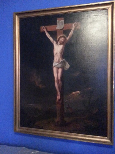 Die Sakristei wird dominiert von einem Kreuzigungsbild Christi (1770 1,10 m breit x 1,45 hoch; siehe Bildergalerie unten). Ursprünglich hing es zusammen mit dem Gemälde der «Verklärung Christi»  (1764 [Angaben variieren von 1761-1767] 395 cm x 230 cm) in der alten, 1738 erbauten, lutherischen Kirche am Graben.  Beide wurden von dem Hofmaler Johann Heinrich Tischbein d. Ä. (1722 bis 1789) gestaltet. Die alte lutherische Kirche am Graben ist die «Mutterkirche» der Lutherkirche (zweite lutherische Kirche) und der Friedenskirche (dritte lutherische Kirche) und wurde im Zweiten Weltkrieg vollständig zerstört. Die Gemälde blieben dank Auslagerung erhalten und wurden auf die beiden verbliebenen lutherischen Gemeinden aufgeteilt. Nachdem die Lutherkirche am Lutherplatz 2013 entwidmet und zur Jugendkulturkirche cross umgestaltet wurde, befindet sich die «Verklärung Christi» in der Kapelle des Hauptfriedhofs. Die Sakristeifenster wurden 1992 gestaltet, nachdem ein Teil der Glasscheiben gesprungen und die Eisenrahmen gerostet waren. Der Kirchenvorstand beschloss eine schlichte Gestaltung in roten, abgestuften Tönungen mit Bleistegen (Gemeindebrief Nr. 213 1992). Der Entwurf stammt vom Nürnberger Glasmaler Jochen Dorn, die Ausführung oblag der Firma Derix Glasgestaltung in Taunusstein.