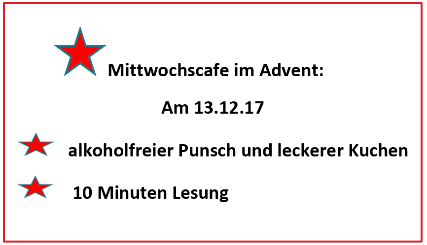Kultur im Mittwochscafé 7. Dezember 20177. Dezember 2017 by L. Kiepe L. Kiepe Im Dezember gibt es jeden Mittwoch von 15 bis 18 Uhr im Mittwochscafé ein adventliches Programm: (mehr …) Continue Reading