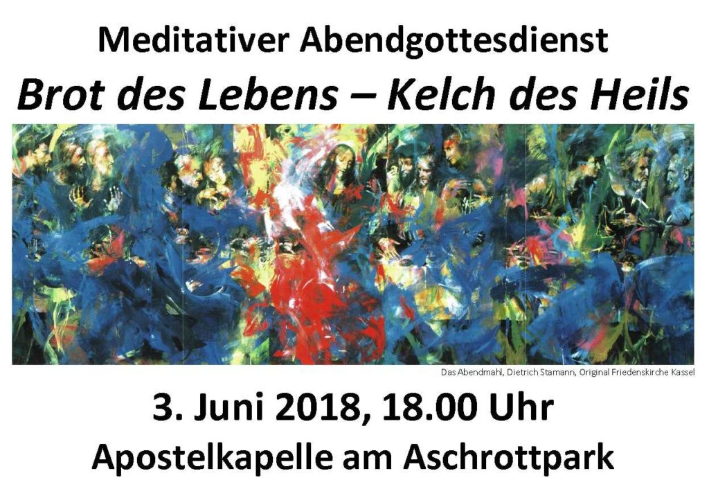 Wir laden herzlich zu einem Meditativen Abendgottesdienst am 3. Juni um 18 Uhr in die Apostelkapelle am Aschrottpark (Friedrich-Ebert-Str. 249a) ein. (mehr …)