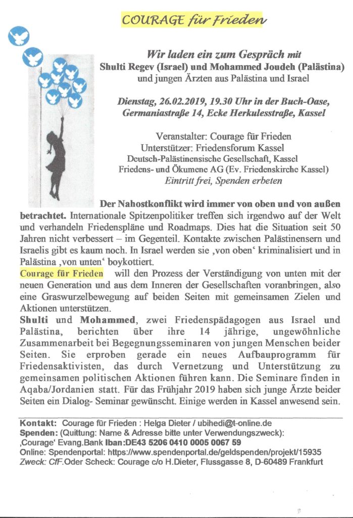 Am Dienstag, 26. Februar findet ab 19.30 Uhr die Veranstaltung "Courage für Frieden" in der Buch-Oase, Germaniastraße 14, Ecke Herkulesstraße statt. (mehr …)
