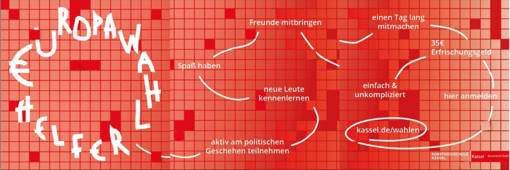 Schon im Mai 2019 steht die nächste, die neunte Direktwahl zum Europäischen Parlament an. Die Stadt Kassel benötigt je Wahl bis zu 1800 Personen, die als Wahlhelferinnen und Wahlhelfer tätig werden. Mit einer Kampagne in Social Media und auf Plakaten sucht die Stadt insbesondere junge Wahlhelferinnen und Wahlhelfer. (mehr …)