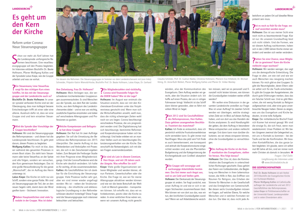 Gemeinsam mit Dr. Beate Hofmann, Bischöfin der Evangelischen Kirche von Kurhessen-Waldeck (EKKW) und Pfarrer Wolfgang Kallies, Geschäftsführer des Reformprozesses der EKKW, erläutert Lukas Kiepe, Gemeindeglieder der Friedenskirche, im Blick-in-die-Kirche-Interview (1/2021) die Aufgaben der Steuerungsgruppe. (mehr …)