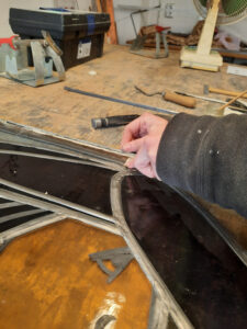 Nun wurden neue Haften aus Kupferdraht aufgelötet und neue Windeisen angebracht. Windeisen sind dünne Metallstäbe zur Verstärkung von Bleiverglasungen. Die Windeisen wurden hergestellt aus rostfreiem Edelstahl (V2A).