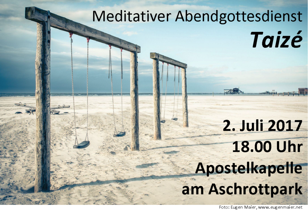 Der Meditative Abendgottesdienst am Sonntag, 2. Juli 2017, findet um 18 Uhr als Taizé-Gottesdienst in der Apostelkapelle im Aschrottpark statt. Ein Team aus Ehrenamtlichen um Pfarrer Carsten Köstner-Norbisrath gestaltet den Gottesdienst. (mehr …)