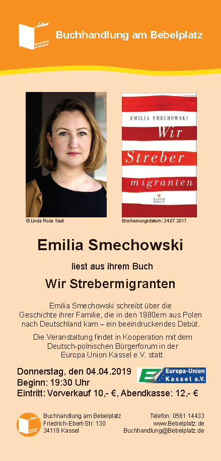 Das Deutsch-Polnische Bürgerforum in der Europa Union Kassel organisiert gemeinsam mit der Buchhandlung am Bebelplatz eine Lesung mit Emilia Smiechowski und ihrem Debütroman: „Wir Strebermigranten“! (mehr …)