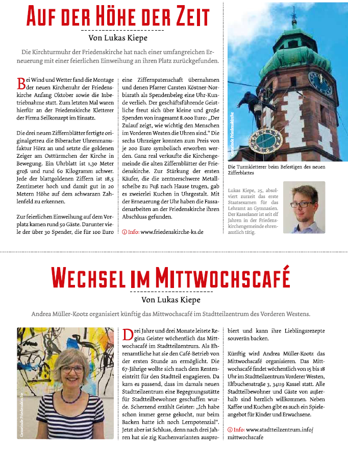 Nach einem spannenden documenta-Sommer erarbeiteten Bürgerinnen und Bürger als die Vor-Ort-Experten zusammen mit dem Stadtbüro-Team die aktuelle mittendrin Nr. 10 für das Quartier Friedrich-Ebert-Straße. Hier geht's zum 24-seitigen Quartiersmagazin: (mehr …)